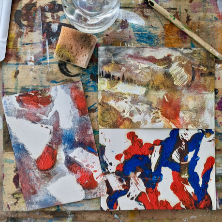 Dafür nutzen wir neben Acrylfarben auch Steinmehle und Asche sowie alles, was uns sonst noch in die Hände fallen möchte.